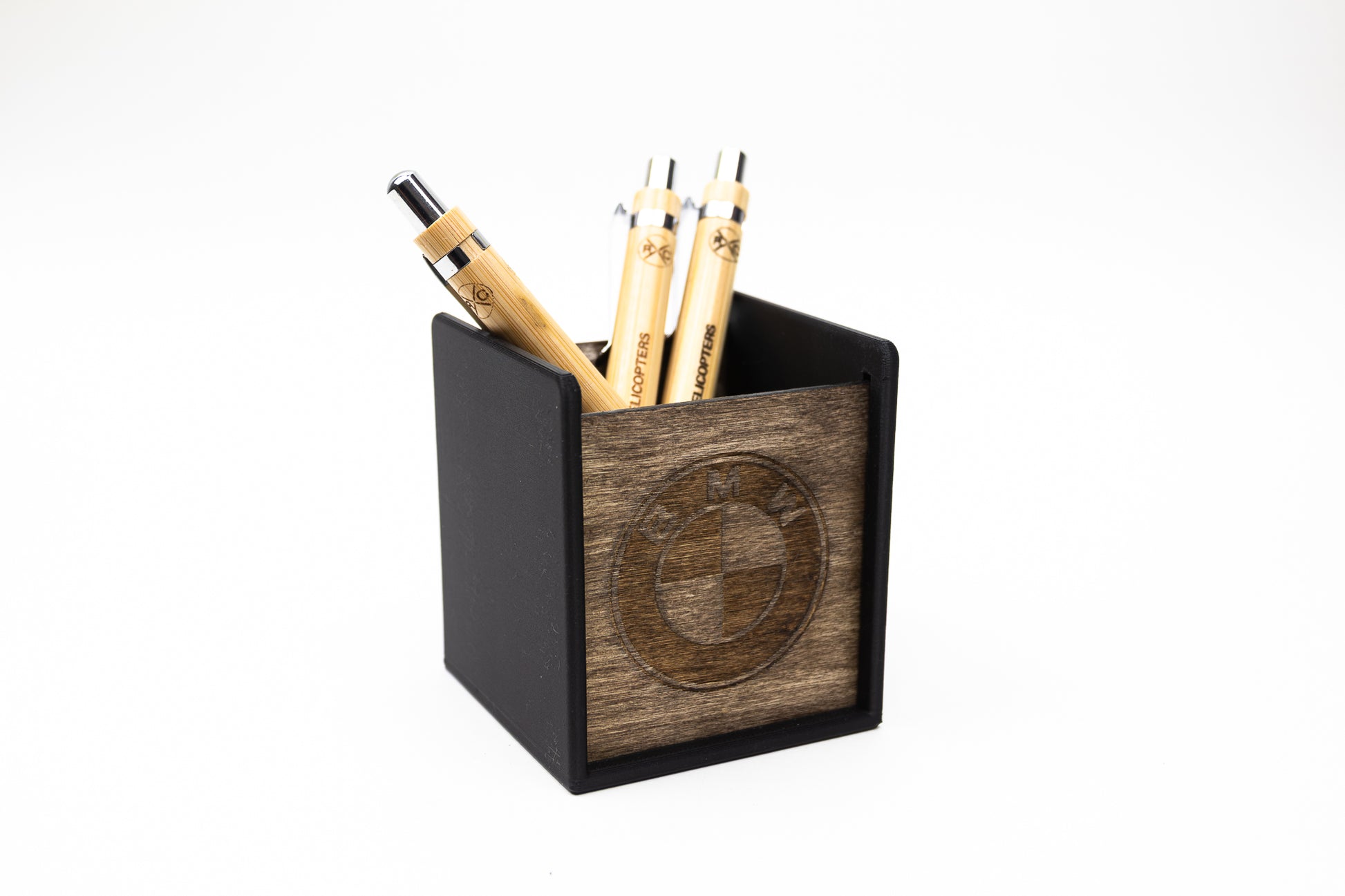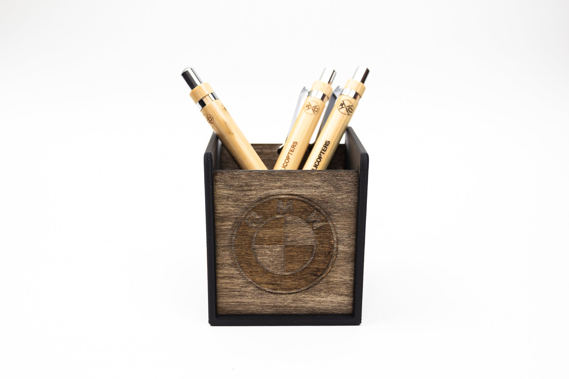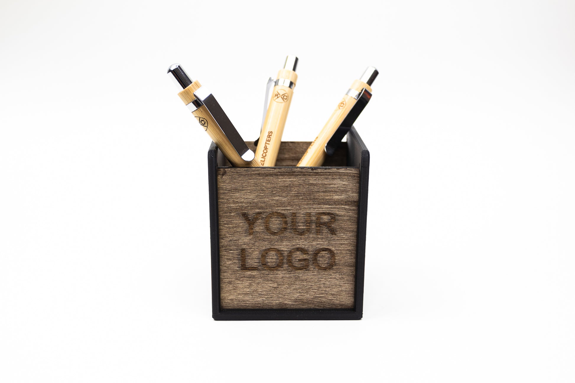 Elevate your workspace with this custom pen holder, crafted from durable PLA filament and finished with real wood panels on the front and back for a warm, premium look. Your name, logo, brand, or custom design is precision laser engraved onto the wood, creating a crisp, permanent personalization that won’t fade or peel.