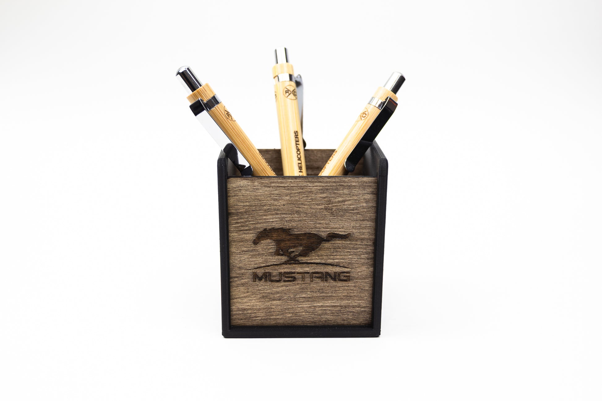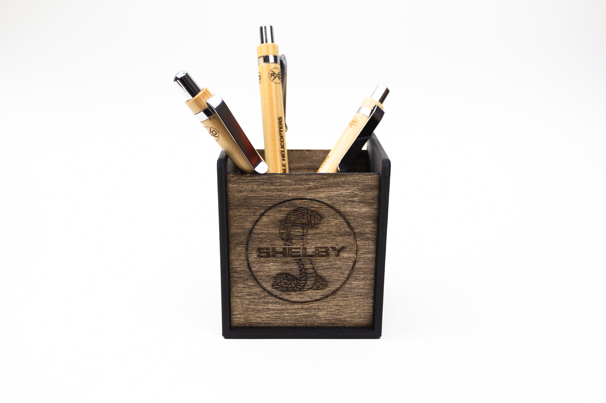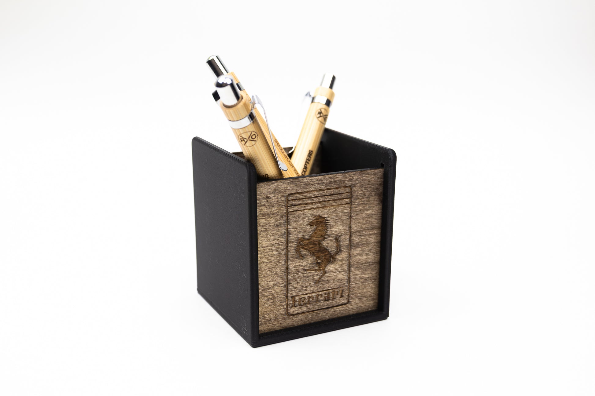 Elevate your workspace with this custom pen holder, crafted from durable PLA filament and finished with real wood panels on the front and back for a warm, premium look. Your name, logo, brand, or custom design is precision laser engraved onto the wood, creating a crisp, permanent personalization that won’t fade or peel.